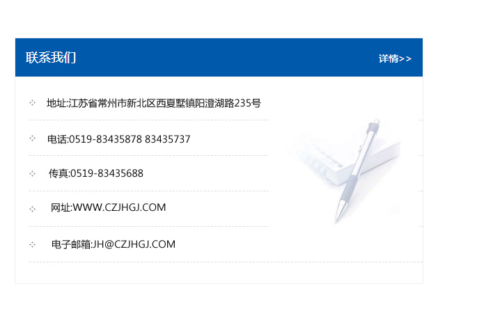 地址:常州市新北區友邦商務大廈1幢16、17層  電話:0519-85101652  傳真:0519-85112595  郵編:213022  網址:www.cz-jiayue_cn.chenglijt.com  郵箱:xiajifengaa@163.com